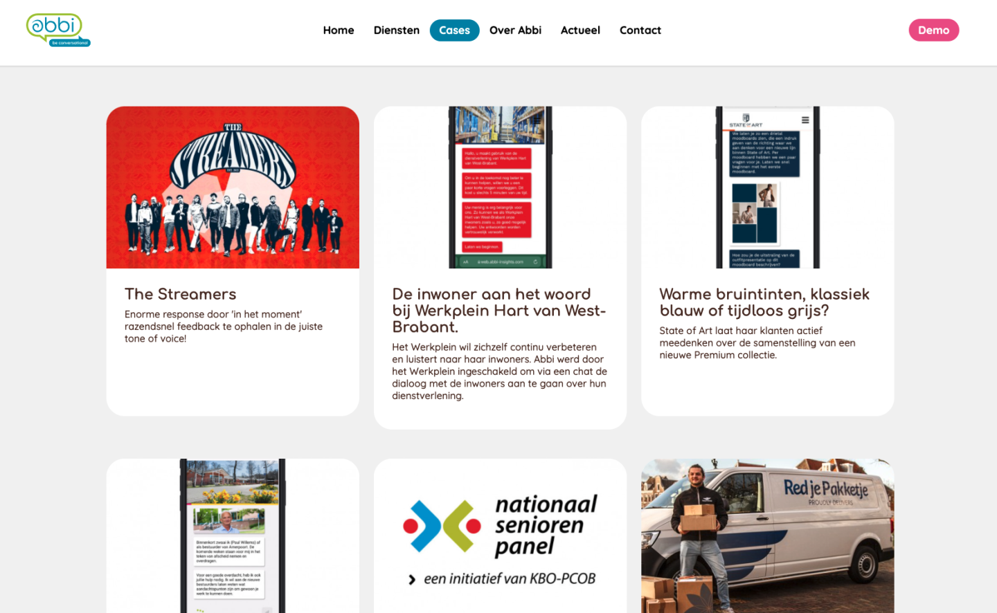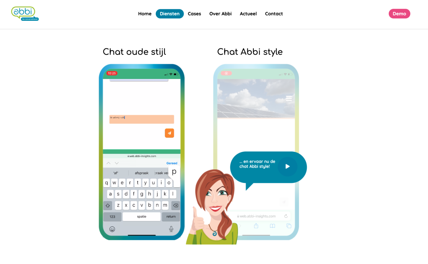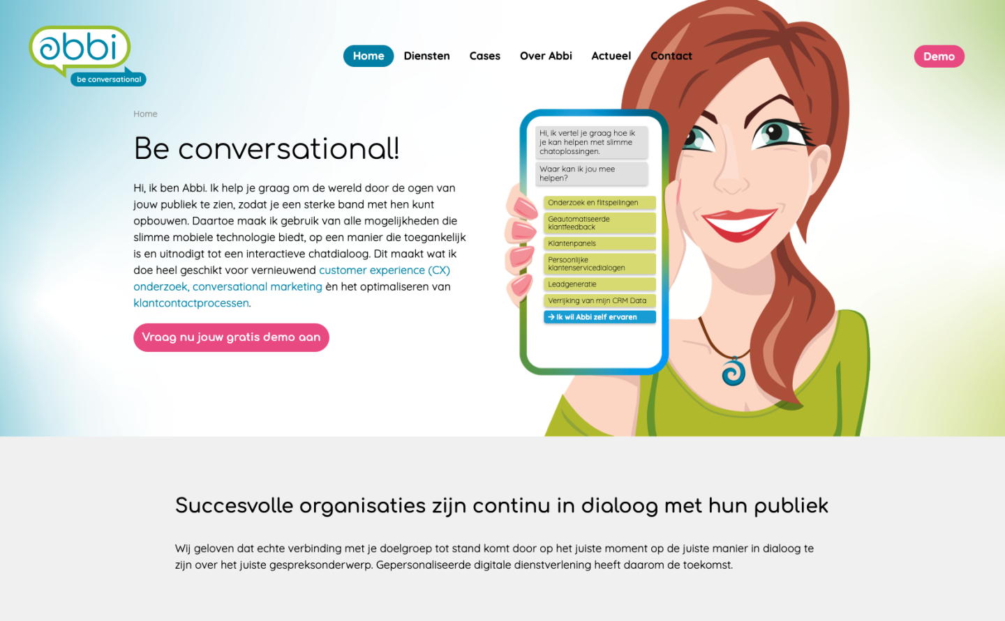 Abbi Insights helpt je graag om de wereld door de ogen van jouw publiek te zien, zodat je een sterke band met hen kunt opbouwen. Daartoe maakt zij gebruik van alle mogelijkheden die slimme mobiele technologie biedt, op een manier die toegankelijk is en uitnodigt tot een interactieve chatdialoog.