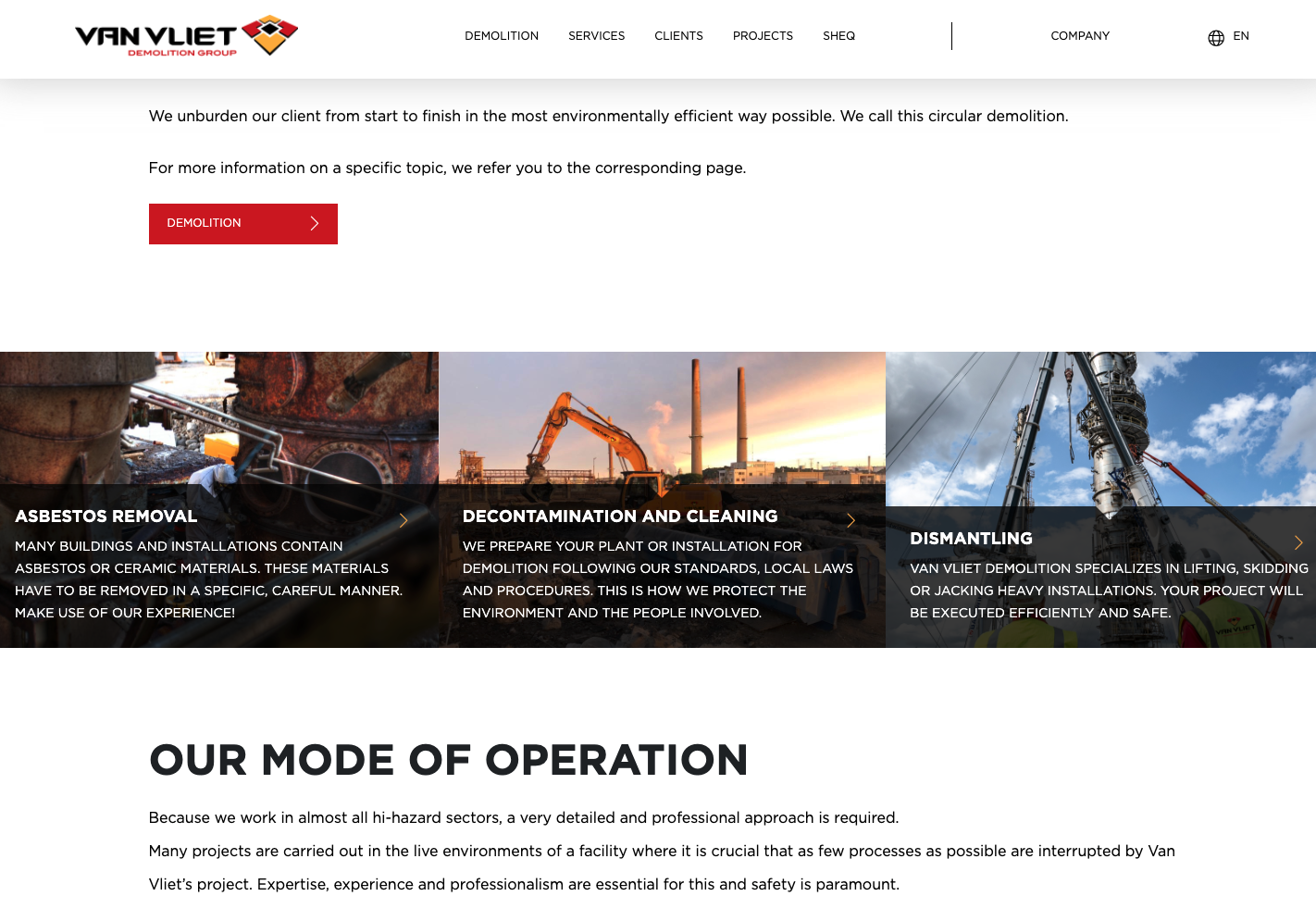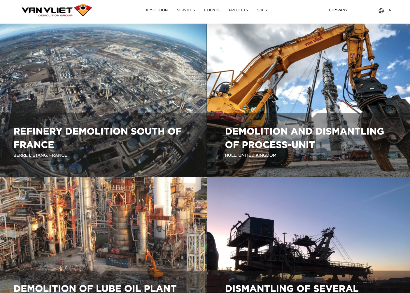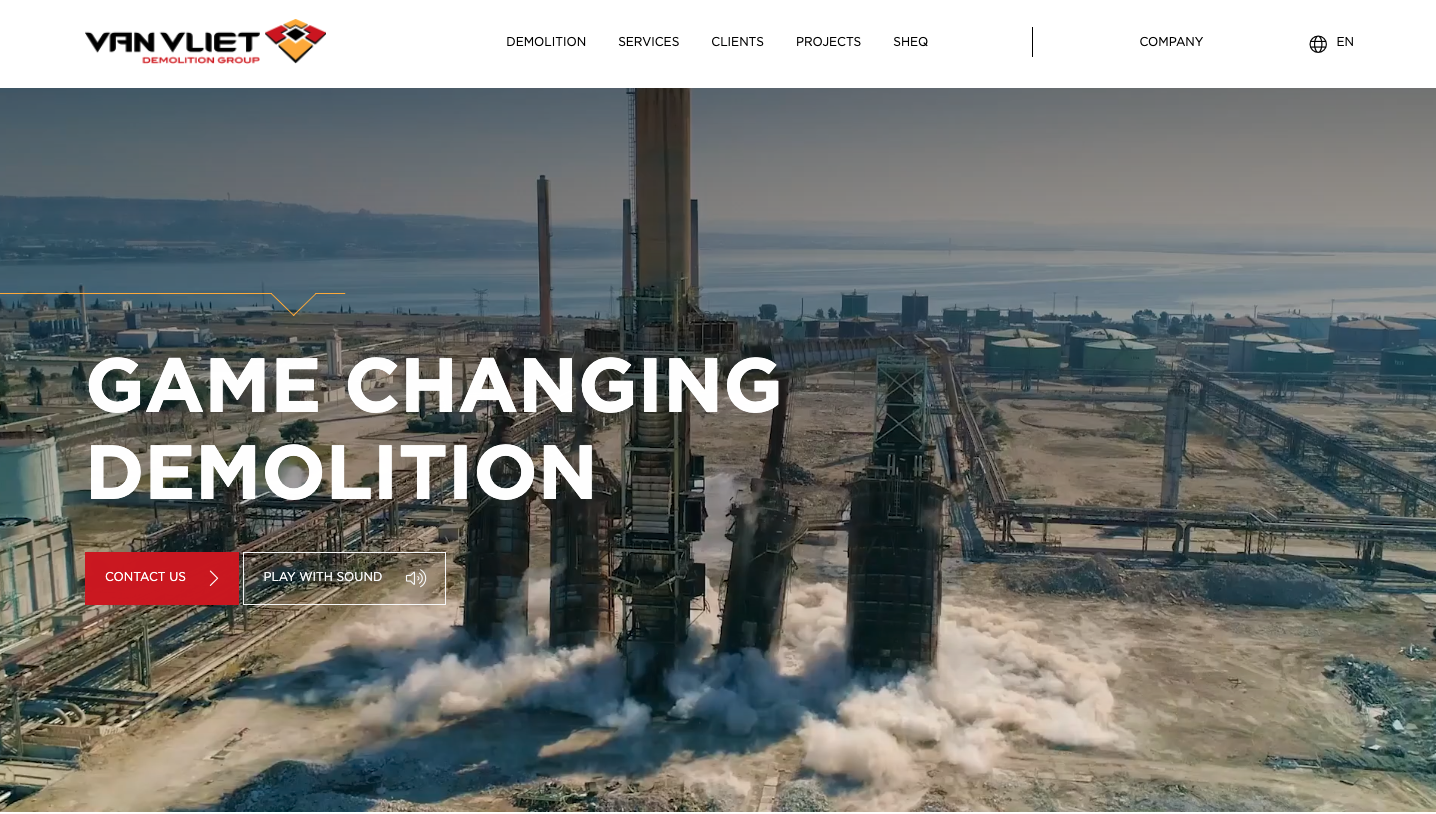 Van Vliet Demolition is een ervaren speler in de internationale sloopwereld. Waar Modus graag ontwerpt en bouwt leeft Van Vliet zich uit door het neerhalen van olieraffinaderijen, fabrieken en chemische installaties.